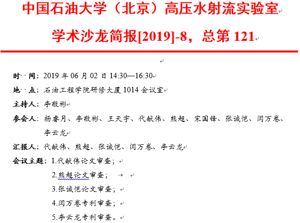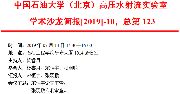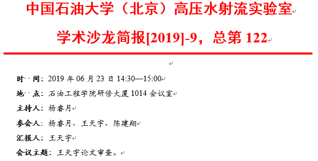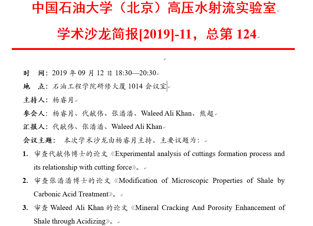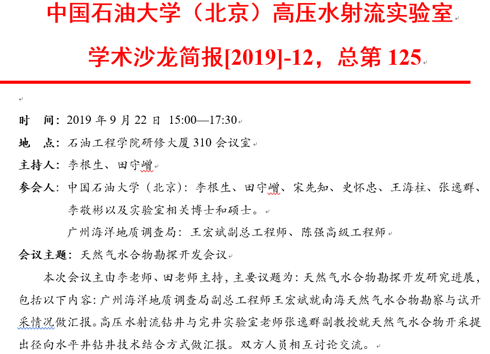 文化建设 收起 学术沙龙 文体活动 短文分享 友情链接 下载专区 OA平台 学术沙龙简报[2019]-12,总第1252019-10-01 天然气水合物勘探开发会议 本次会议主由李老师、田老师主持,主要议题为:天然气水合物勘探开发研究进展,包括以下内容:广州海洋地质调查局副总工程师王宏斌就南海天然气水合物勘察与试开采情况做汇报。高压水射流钻井与完井实验室老师张逸群副教授就天然气水合物开... [查看详情 ] 学术沙龙简报[2019]-11,总第1242019-09-19 1.审查代献伟博士的论文《Experimental analysis of cuttings formation process and its relationship with cutting force》。 2.审查张潘潘博士的论文《Modification of Microscopic Properties of Shale by Carbonic Acid Treatment》。 3.审查Waleed Ali Khan的... [查看详情 ] 学术沙龙简报[2019]-10,总第1232019-07-17 1.宋恒宇论文审查; 2.张羽鹏专利审查。 [查看详情 ] 学术沙龙简报[2019]-9,总第1222019-06-27 1.王天宇论文审查。 [查看详情 ] 学术沙龙简报[2019]-8,总第1212019-06-10 1.代献伟论文审查; 2.熊超论文审查; 3.张诚恺论文审查; 4.闫万卷专利审查; 5.李云龙专利审查。 [查看详情 ] 共93条记录 11/19页 首页 上一页 下一页 尾页 第 1 2 3 4 5 6 7 8 9 10 11 12 13 14 15 16 17 18 19 页
