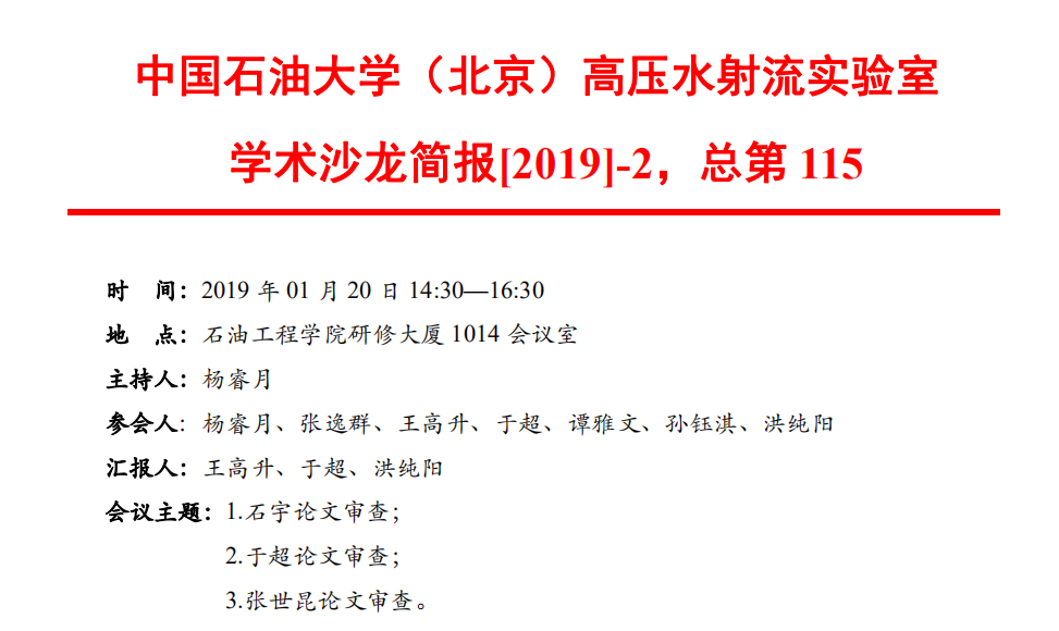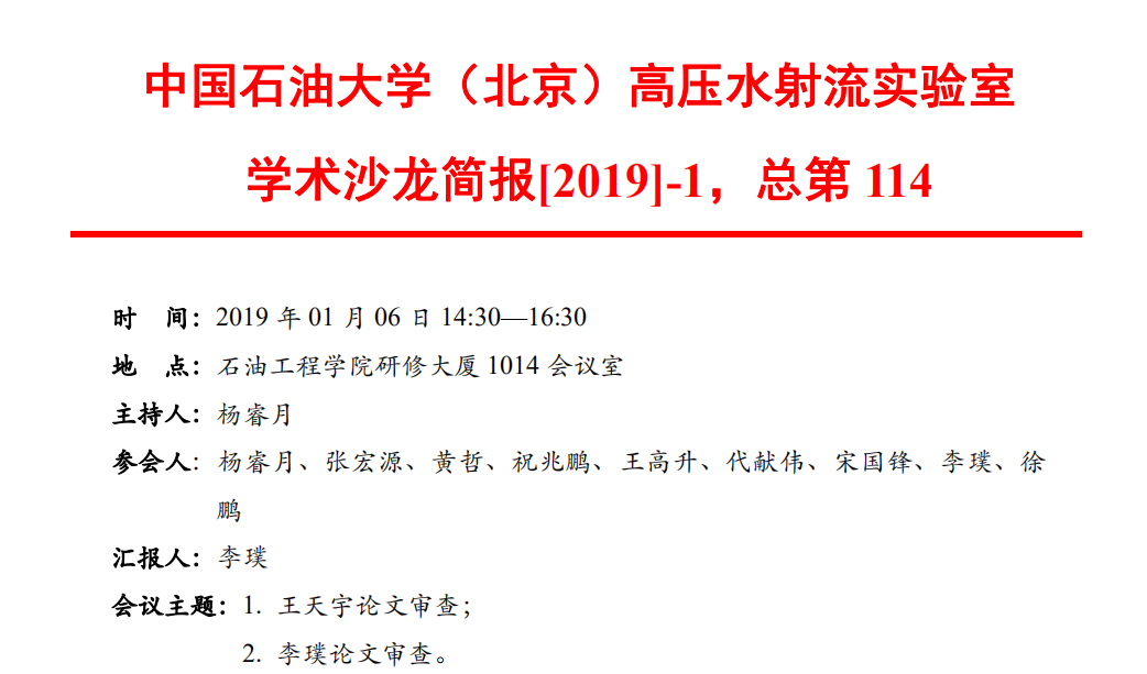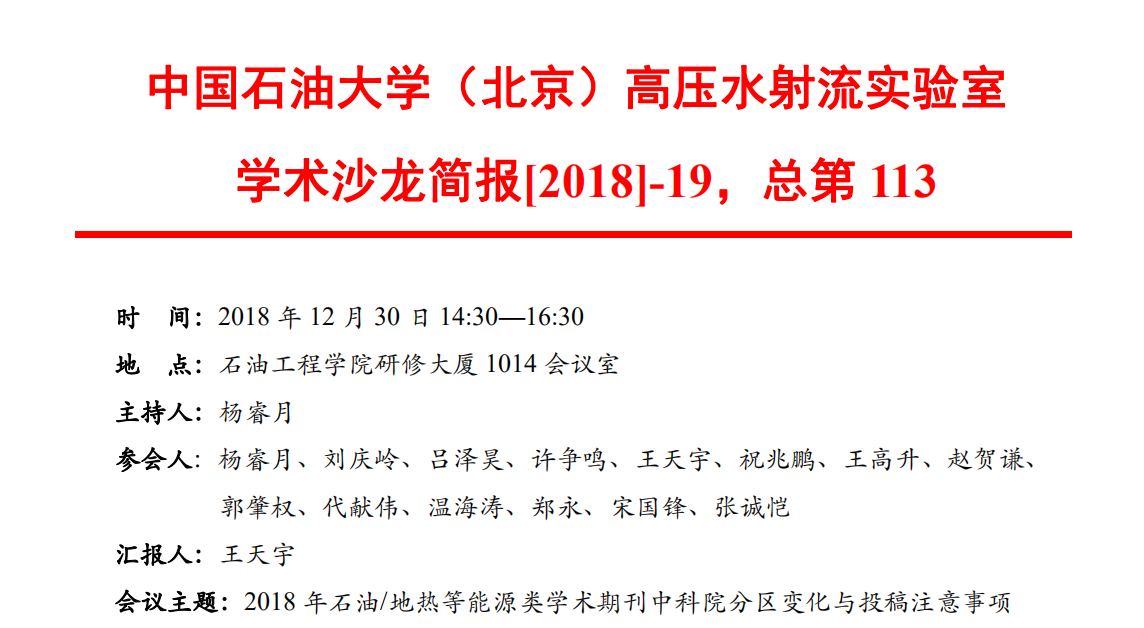 文化建设 收起 学术沙龙 文体活动 短文分享 友情链接 下载专区 OA平台 学术沙龙简报[2019]-2,总第1152019-01-21 [查看详情 ] 学术沙龙简报[2019]-1,总第1142019-01-21 1. 王天宇论文审查; 2. 李璞论文审查。 [查看详情 ] 学术沙龙简报[2018]-19,总第1132019-01-21 2018年石油/地热等能源类学术期刊中科院分区变化与投稿注意事项 [查看详情 ] 学术沙龙简报[2018]-18,总第1122019-01-21 会议主题: 1. 张宏源论文审查; 2. 武晓光论文审查; 3. 黄鹏鹏论文审查。 [查看详情 ] 学术沙龙简报[2018]-17,总第1112018-12-16 1. 宋恒宇论文审查; 2. 近期投稿Fuel期刊论文审查与讨论。 [查看详情 ] 共93条记录 13/19页 首页 上一页 下一页 尾页 第 1 2 3 4 5 6 7 8 9 10 11 12 13 14 15 16 17 18 19 页